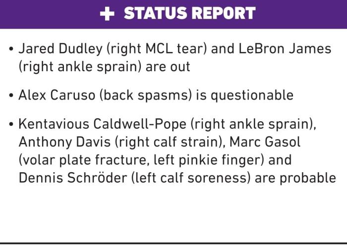 24直播网讯 北京时间4月30日,洛杉矶湖人公布下一场对阵国王的伤病报告,勒布朗-詹姆斯因脚踝扭伤继续休战,卡鲁索被列为出战成疑,浓眉(小腿拉伤)、波普(脚踝扭伤)、小加索尔(手指骨折)和施罗德(小腿酸痛)都是大概率出战。