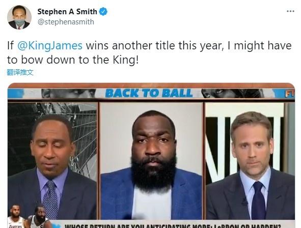 美国名嘴斯蒂芬·A·史密斯发推晒出了自己今日参加节目的照片,并附文“我心目中的GOAT永远是乔丹,但是如果詹姆斯击败小卡、乔治以及隆多领军的快船,之后挑落篮网三巨头,我做出承诺,从此我对他服服帖帖,在他职业生涯剩余的时间里永不再说他一句坏话。”
