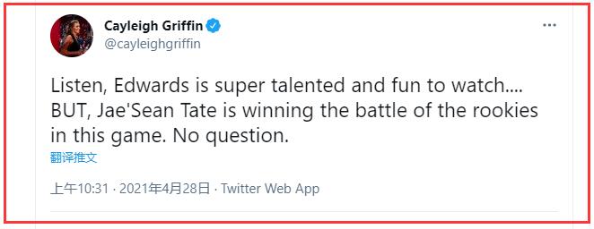 另一位记者Cayleigh Griffin则在个人社媒上写道:听着,爱德华兹拥有超级天赋且值得期待,但是,杰西恩泰特是这两位新秀在这场直接对话中的胜利者,没有问题!