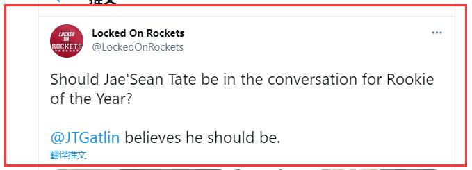 而这场比赛过后,在聊到泰特是否能进入本赛季最佳新秀的讨论时,休城记者Jackson Gatlin表示:相信他一定可以!