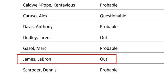24直播网讯 北京时间4月28日,NBA官网公布了明天湖人vs奇才的最新伤病名单。湖人队一方,詹姆斯和杜德利同为Out,两人继续缺阵;浓眉、波普、小加索尔、施罗德同为Probable(75%可能出战),大概率能打;上一场出现背部痉挛的卡鲁索状态为Questionable(50%可能出战)。