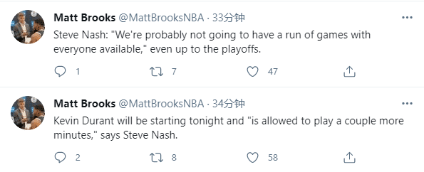 谈到阵容不齐整的问题,篮网主教练纳什表示:我们可能在季后赛开打前都没法让全员都上场磨合,甚至到了季后赛,我们也可能会面临人员不整的问题,大量球员缺阵让我们始终很难找到一个明确且稳定的轮换阵容,但我的工作就是不断找到不同的赢球模式。