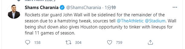24直播网讯 北京时间4月27日,据名记Shams报道,消息人士透露,火箭球星沃尔将因腿筋拉伤缺席本赛季剩余比赛,交易来球队后一直没出战的艾克萨姆也赛季报销!