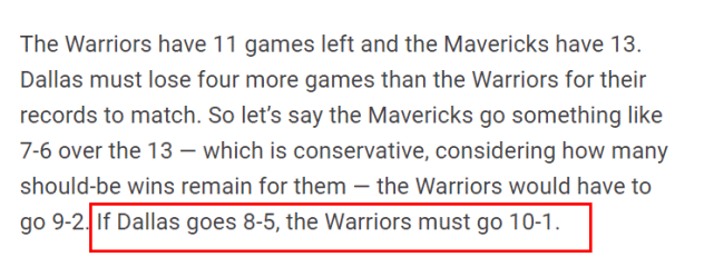 勇士跟队记者安东尼-斯雷特指出,独行侠还剩13场,如果勇士想要最终冲上第六,很重要的一点,是力争比独行侠少输4场比赛。如果独行侠最终13场是7胜6负,勇士就得9胜2负,如果独行侠8胜5负,勇士就必须10胜1负!