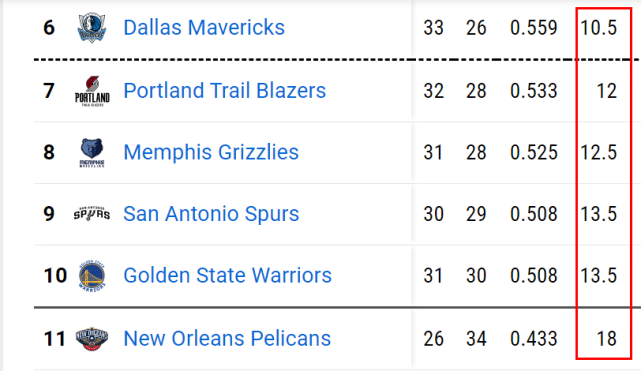先来看看最新的西部第6-第11位的排名。排在第6的是33胜26负的独行侠,第7-11位的依次是开拓者、灰熊、马刺、勇士和鹈鹕。鹈鹕和勇士之间已经有4.5个胜场的差距,他们想冲击附加赛希望渺茫。勇士虽然排在第十,但他们和独行侠之间是3个胜场的差距,再结合库里目前的状态,存在理论上的追赶希望。