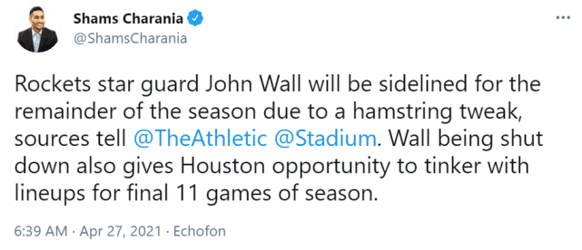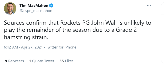 24直播网讯 北京时间4月27日,据名记查拉尼亚报道,火箭后卫约翰-沃尔因腿筋拉伤将缺席本赛季余下的所有比赛。火箭已经提前无缘季后赛,沃尔这时候被安排“赛季报销”,显然也是球队为了试验新阵容,当然,也得继续摆烂,确保能以倒数前三的成绩结束本赛季。随后,名记麦克马洪跟进报道,沃尔遭遇腿筋二级拉伤。