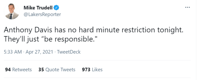 浓眉复出后,连续两场对阵独行侠,第一场比赛打了16分40秒,第二场比赛打了28分19秒。沃格尔表示,湖人仍会密切关注浓眉的出场时间,但已经没有硬性限制。这意味着浓眉可以获得更多的出场时间,来帮助他找回状态。
