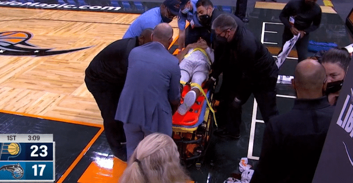 24直播网讯北京时间4月26日,魔术和步行者比赛中,场上发生意外受伤事件,魔术十天短合同球员德文-坎纳迪惨遭重伤,才上场仅打1分钟却不幸重伤离场,小腿严重受伤,被工作人员用担架抬离现场。