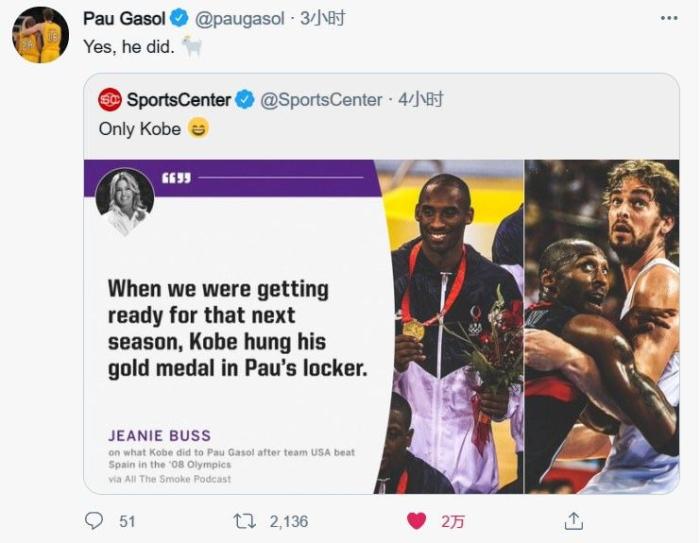 对于这个故事,加索尔也是转发并且评论道:“是的,他确实是这么干了。GOAT!”看来加索尔对于科比的新闻还是非常的关注,只要相关他就会转发评论。2009年湖人队在总决赛里面对的敌人是奥兰多魔术队,魔术内线霍华德是内线巨兽,对于加索尔来说这是一项非常大的挑战,但是加索尔不仅仅是顶住了魔兽霍华德的冲击,反而帮助湖人队在内线打出了缺口,让魔术的内线优势发挥不出来。最终湖人4比1淘汰了奥兰多魔术,加索尔和科比的组合第一次拿到了NBA总冠军,胜利来之不易。