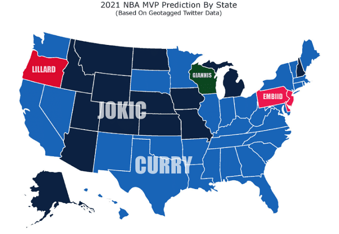 除了官方的MVP榜单之外,美媒根据统计制作了全美各州对MVP的预测,这其中可以看到库里取得了压倒性的优势,也就是说这些州的大部分球迷都支持库里获得MVP;本赛季的库里场均31.1分5.5篮板5.9助攻,其中得分和场均得分是联盟第一,不过联想到库里所在勇士的战绩糟糕,所以就连库里自己都说很有可能无法斩获MVP;