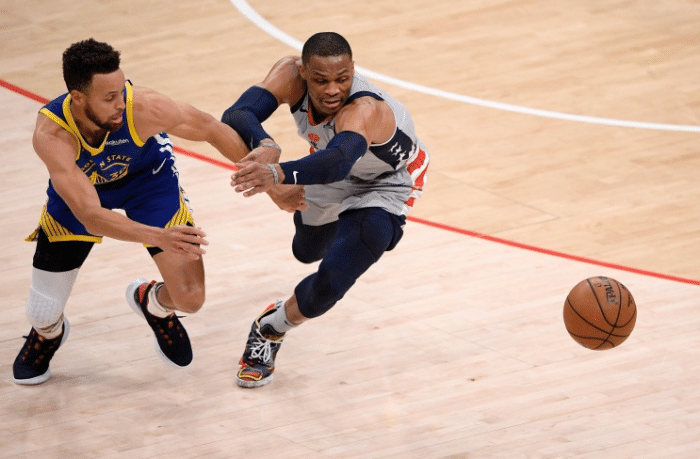 24直播网讯 最近一场比赛,奇才118-114击败勇士,和两队上一次相遇一样,勇士打到第四节中段还占据领先优势,然而最后5分钟崩盘!诚然,这里面有维金斯上篮不中的因素,而库里的表现却难得一见的低迷,全场25中7,其中三分球14中2,只拿到18分7篮板8助攻,此外还有6次失误!进入4月份以来,库里场均40分,但唯独遇到奇才不好使,赛后,奇才主教练布鲁克斯和核心比尔都谈到了一个关键问题:威少在防守端的表现,居功至伟!