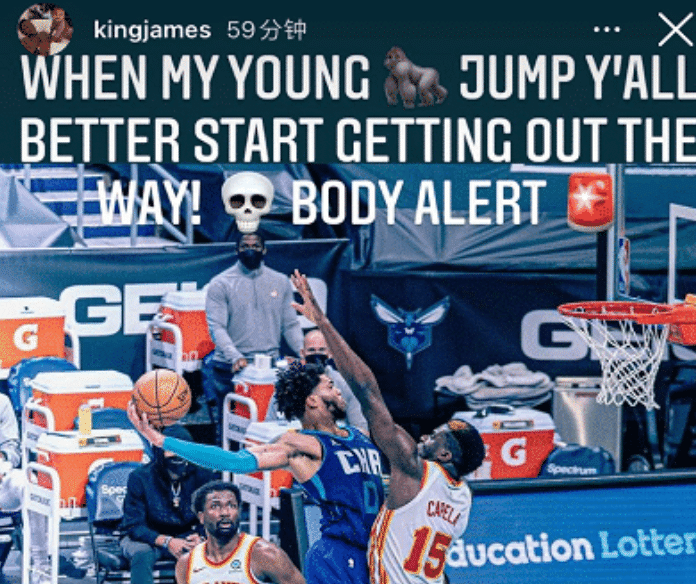 现在的布里奇斯被称为是“场均一隔扣”说的就是布里奇斯的状态很好,几乎每场比赛都会贡献超级扣篮的表演。这其中最出名的要说是11天前,4月12日黄蜂对阵老鹰,面对本赛季的联盟篮板王卡佩拉,布里奇斯也是丝毫不畏惧,直接空切暴扣隔扣了卡佩拉,这个扣篮当时就引发了很大的热议,包括詹姆斯也给自家经纪公司的球员送上了祝福,惊呼他的扣篮太爆炸了。