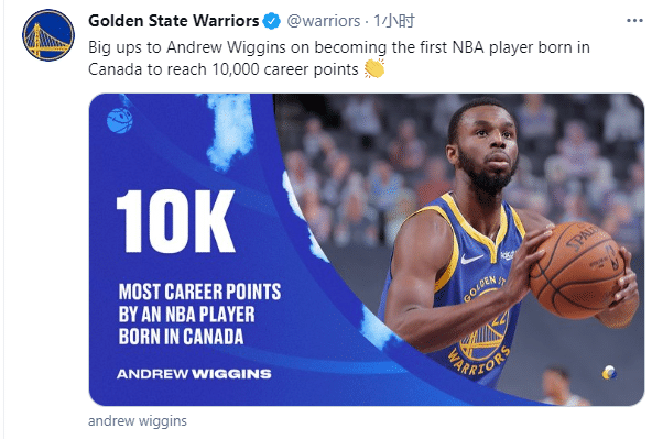 勇士官方第一时间恭喜库里解锁18000分里程碑,不久前,勇士球星维金斯也迎来里程碑时刻,成为NBA历史上第一位得分破万的加拿大球员。