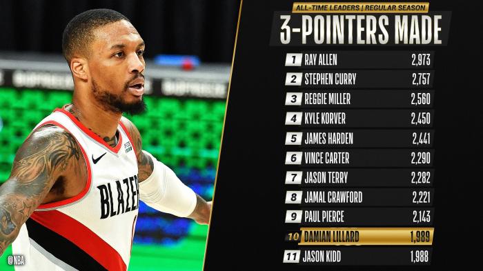 24直播网讯北京时间4月22日,开拓者和掘金比赛中,利拉德伤愈复出,复出首战的进攻状态不错,首节早早命中三分球,因此利拉德破纪录,常规赛三分命中数达到1989记,正式超越名宿贾森-基德(湖人助教),升到NBA历史三分榜第10位。