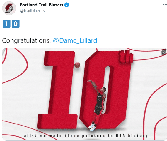 开拓者官方也晒图祝贺利拉德,发推写道:历史第10人,恭喜利拉德。