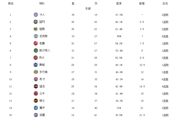 24直播网讯今天NBA常规赛有多达12场比赛,其中有11支东部球队出战,榜首的前两名费城和篮网都输了球、尼克斯豪取8连胜升至前四、奇才掀翻勇士取得6连胜杀入前十,同时步行者和猛龙等队也都赢球了,公牛、老鹰和活塞都输了球,这也让东部的格局发生了很大的变化: