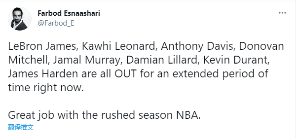 快船记者发推写道:詹姆斯、小卡、浓眉、米切尔、贾马尔-穆雷、利拉德、杜兰特和哈登八大球星都因伤缺席了很长一段时间。