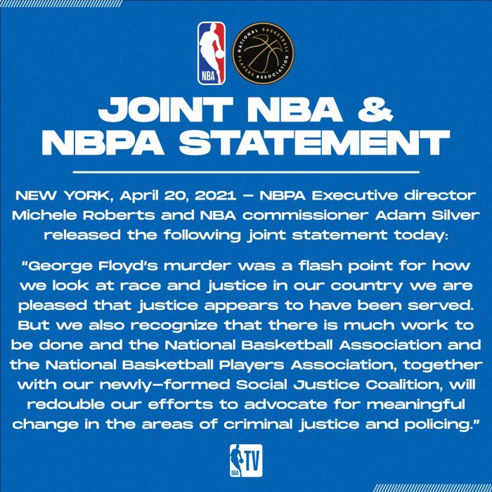 NBA官方联合NBPA(球员工会)发表声明:我们很高兴看到正义得到伸张。