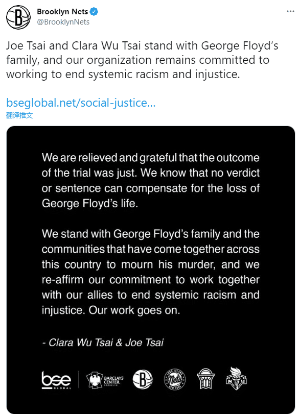 篮网、雄鹿、奇才等多支球队也发表声明,篮网老板蔡崇信代表球队发声:我们与乔治-弗洛伊德的家人站在一起,我们球队仍旧致力于消除种族歧视和不公平的现象。