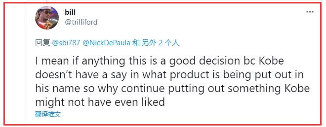 一位名为bill的球迷表示:我的意思是,这是一个好的决定,因为科比对以他的名义推出的产品没有发言权,那为什么还要继续推出甚至连科比都不喜欢的产品呢?