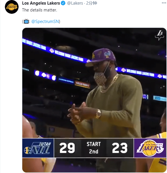 24直播网讯 湖人和爵士比赛中,詹姆斯因伤继续缺席比赛,继续坐在场边为队友加油打气,期间詹姆斯突然变身詹指导,穿金戴钻十分抢镜,站在湖人替补席指导队友,湖人官方晒出这一幕,发推写道:细节很重要;球迷调侃不好好管理饮水机,居然兼职教练了。