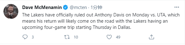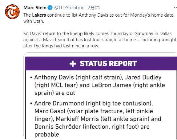 浓眉已经开始参加队内完整训练,但下一场依旧无缘对阵爵士,究竟浓眉何时才能复出?名记Marc Stein发推写道浓眉很可能在周五或者周天对阵独行侠时伤愈复出,湖人队内记者也表示浓眉可能在4连客对阵独行侠时复出,不久前独行侠不敌9连败的国王,遭遇2连败。
