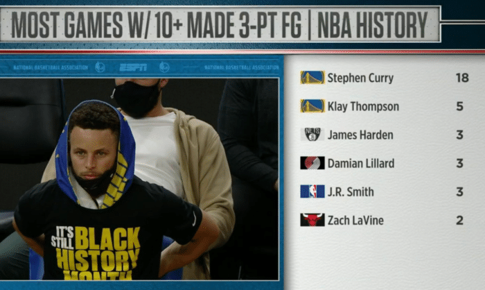中场休息时间依然没有让库里的火热手感冷却下来,进入第三节,萌神再次暴走,单节8中5三分7中4又独得18分3助攻,三节时间已经命中10记三分轰下48分!据统计,这是库里生涯第18次单场命中至少10记三分高居NBA历史第一,而第二和到六加起来一共才16次,不得不说!萌神就是三分之神!