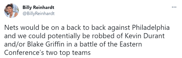 篮网记者Billy Reinhardt表示,这意味着篮网有可能在其中一场比赛中失去杜兰特或者格里芬。两人目前都在伤病管理的名单上,一般情况下应该不会出战背靠背的比赛。如果杜兰特和格里芬打森林狼这场比赛,他们俩可能要缺席下一场对费城的比赛。这样一来,原本阵容深度足够的篮网,也将面临无人可用的危机。