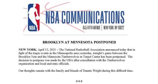 24直播网讯北京时间4月13日,NBA官方宣布,鉴于昨天在明尼阿波利斯地区发生的悲惨事件,今晚(当地时间)布鲁克林篮网队和明尼苏达森林狼队在标靶中心的比赛将推迟进行。比赛延期的决定,是NBA在征询森林狼队以及当地官员后做出的,在公告中,联盟还对当特-赖特的家人和朋友致以哀思。