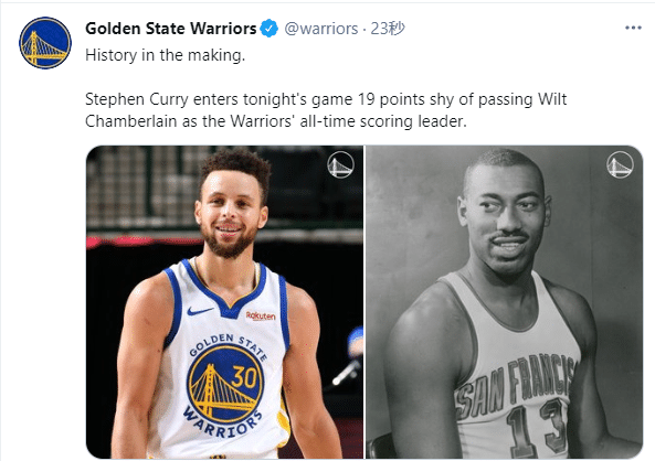 24直播网4月13日讯 恭喜库里得分破纪录,正式超越“上古大神”张伯伦成为勇士队史得分王。