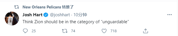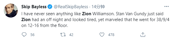 约什-哈特发推盛赞锡安:锡安应该被列为“无人能防”的范畴之内;名嘴斯基普-贝勒斯也发推盛赞:我从未见过像锡安这样的人。斯坦-范甘迪刚刚说锡安需要休息,他看上去很累,但仍热为惊叹他的表现。