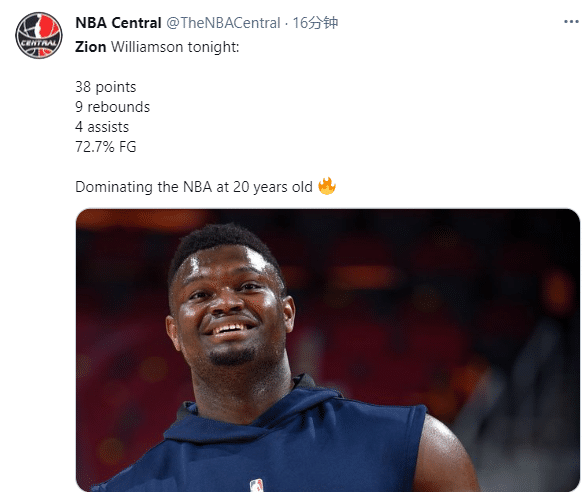 20岁锡安统治禁区太疯狂,一招碾压式突破太狠,即使面对多人包夹,他照样能撕开防线;锡安高效轰下38+9带队击败骑士,美媒NBA Central发推写道:年仅20岁统治NBA。