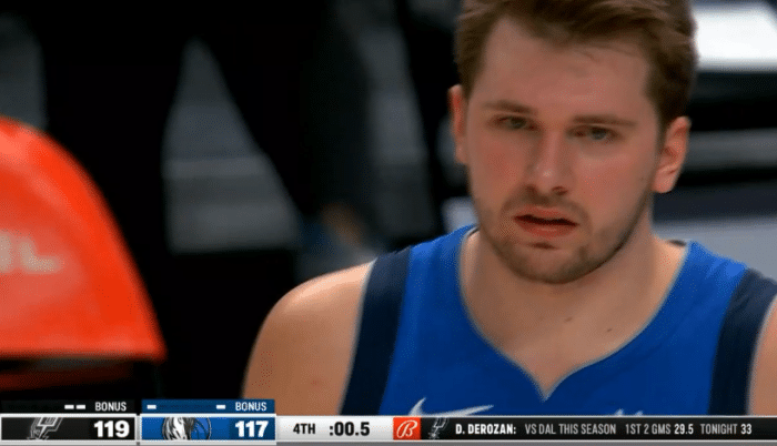 暂停回来镜头对准东契奇,他口吐脏话大骂一声;最后0.5秒,东契奇超远三分太短,直接三不沾从而遗憾惜败;离场时东契奇表情沮丧,又大吼一声,无奈接受被绝杀的命运。