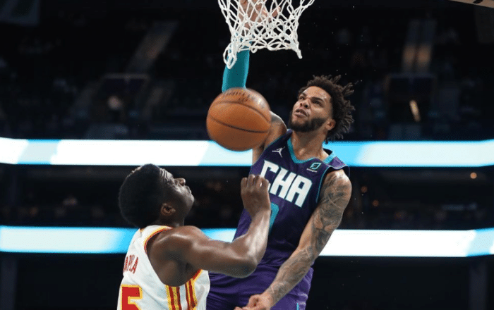 24直播网讯今天NBA常规赛结束了一场早场比赛,黄蜂遗憾的以101-105不敌老鹰,虽然输球,但黄蜂球员布里奇斯也有不俗的发挥,他全场贡献23分7板2助的数据,其中隔扣卡佩拉更是点燃了所有人的激情。