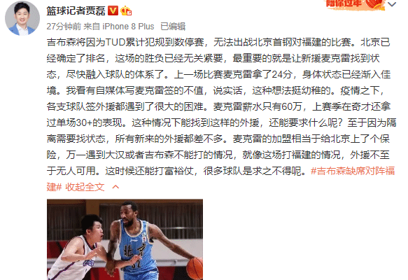 同时贾磊还表示麦克瑞是可以在关键时刻帮助到球队的,虽然队内有中锋汉密尔顿和超级得分手吉布森两位外援,但是当出现伤病等情况,北京首钢还有人可以用,在很多球队都出现伤病导致减员的情况下,这样的富裕仗是很多球队是求之不得。