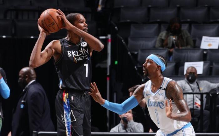 24直播网讯北京时间4月11日 NBA常规赛,篮网主场101-126不敌湖人。这场比赛转折点就是欧文和施罗德双双被罚下,这样湖人队继续扩大领先优势,也宣告了篮网基本追分无望,在第四节基本成为了垃圾时间,但是这时候杜兰特依然在场上,本场比赛是杜兰特伤愈复出后的第2场比赛,他首发出战24分钟,17投8中,罚球5中5,拿到22分7篮板5助攻8失误。最后湖人队已经领先了20多分的时候,纳什主教练也没有将杜兰特换下,这一调整也备受球迷质疑,毕竟杜兰特刚刚伤愈复出,在比赛基本拿不回来的情况下,应该让杜兰特保休息,避免伤病。