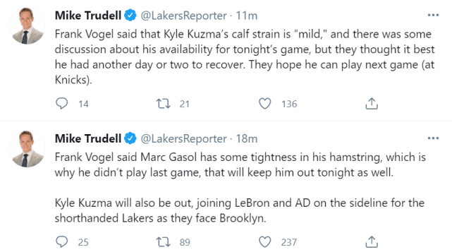 24直播网讯北京时间4月11日,篮网主场迎战湖人。赛前,湖人主帅沃格尔透露,库兹马和小加索尔将因伤缺席对篮网的比赛。库兹马小腿一级拉伤,这是他连续第二场缺阵,而小加出现腿筋紧张的状况,之前一场没有出战就是由于这个原因。