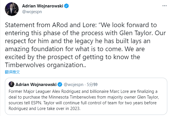 24直播网讯明尼苏达森林狼就要被卖掉了,据ESPN名记沃纳罗斯基报道,三届MLB的MVP得主罗德里格斯和电子商务巨头马克-洛尔已经与森林狼老板格伦-泰勒签下一份意向书,二人斥资15亿美元将接替泰勒成为森林狼的新老板。