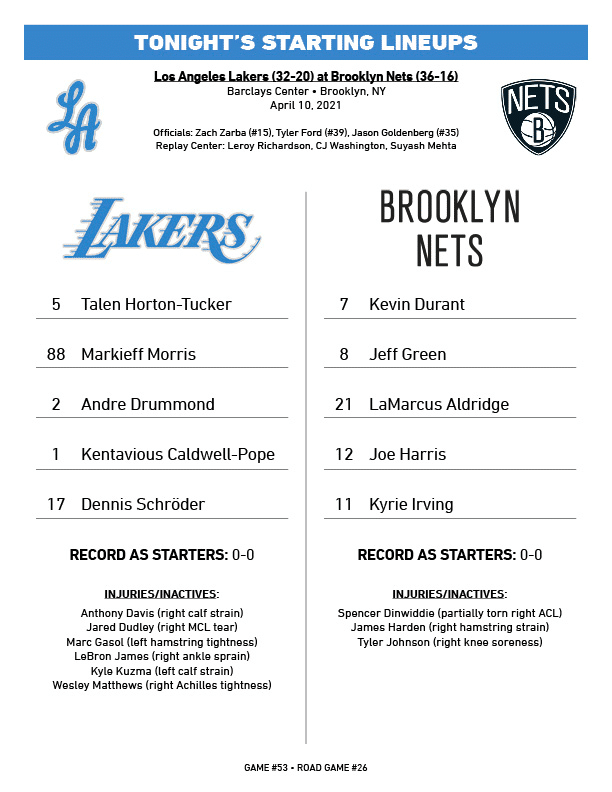 湖人伤病满营,首发五虎是施罗德(1550万)、波普(1207万)、庄神(79万)、大莫里斯(233万)和霍顿-塔克(152万),首发五虎总薪资是3221万美元;反观篮网,纳什派出杜兰特(4011万)、欧文(3333万)、乔-哈里斯、杰夫-格林和阿尔德里奇的豪华首发,就差哈登没有首发出战(哈登伤停)。