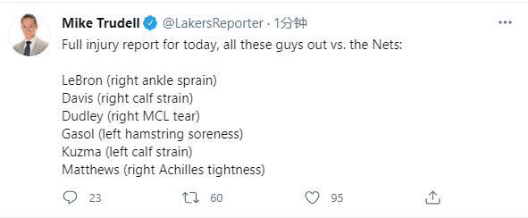 24直播网讯湖人对阵篮网之前,湖人队伤病大名单再次更新,全队多达6名球员因伤无法出战,据湖人随队记者Mike Trudell报道,詹姆斯(脚踝扭伤)、浓眉(小腿拉伤)、库兹马(小腿拉伤)、小加索尔(左腿筋酸痛)、马修斯(右跟腱紧张)和杜德利(韧带伤病)全都伤停,卫冕冠军太惨了。