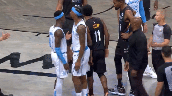 本场比赛第三节,欧文和施罗德激烈互喷,两人都连吃两T被驱逐离场
