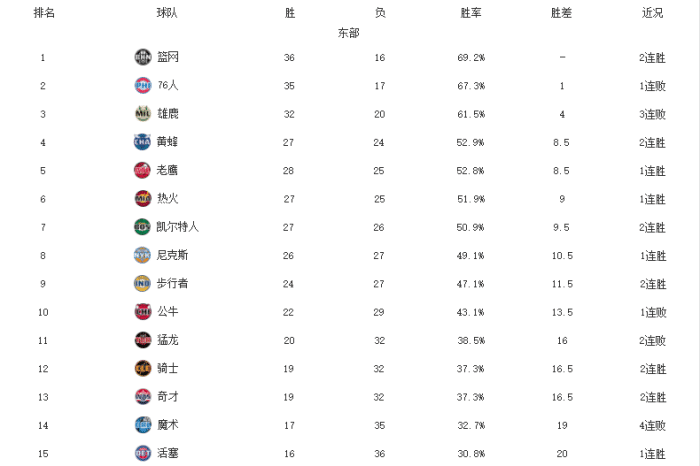 东部1-8名:篮网、费城、雄鹿、黄蜂、老鹰、热火、凯尔特人、尼克斯;