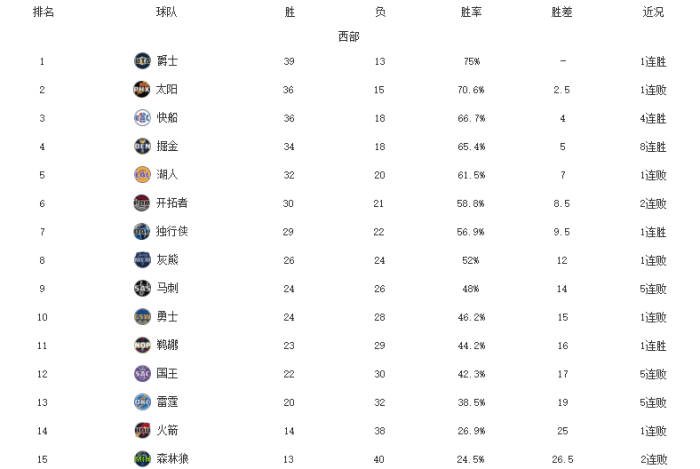 爵士的战绩是39胜13负,75%的胜率联盟第一。太阳昨天输给快船结束连胜,放缓了冲击榜首的脚步。快船今天一度落后火箭14分,但他们单节领先31分建立优势,拿下4连胜。约基奇带队今天以2分优势险胜马刺,掘金已经拿下了8连胜,稳居前四。湖人明天将会有不小的考验,他们客场挑战篮网。开拓者吃到2连败,他们昨天输球非常可惜。独行侠近期的表现不佳,在东契奇和波尔津吉斯的带领下他们依旧有希望冲击前六直通季后赛。灰熊今天遗憾的输给了尼克斯,连胜势头被终结。