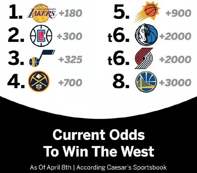 24直播网讯NBA常规赛进行到现在,大部分的球队都只剩下18-21场常规赛,西部的竞争是非常激烈的,榜首的爵士已经拿到了75%的胜率,太阳已经确定赛季胜率达到50%,到第10名的勇士,快船和掘金等队也都有不俗的表现。那么说谁可以从残酷的西部中杀出重围,晋级总决赛呢?近日ESPN的篮球数据专家Kirk Goldsberry进行的统计,给出了各队入围的概率。