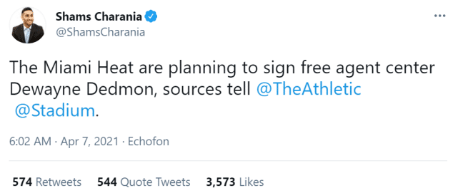 24直播网讯北京时间4月7日,据NBA名记查拉尼亚报道,热火计划和自由球员中锋戴德蒙签约。31岁的戴德蒙身高2米13,体重111公斤,生涯场均6.4分6篮板,投篮命中率51.6%,三分命中率33.3%。2019-20赛季,戴德蒙为国王出战34场,场均5.1分4.9篮板,为老鹰出战10场,场均8.1分8.2篮板。