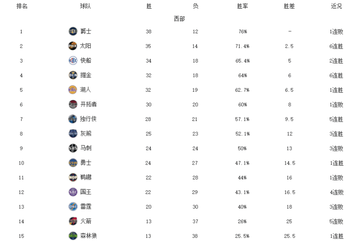爵士昨天输球之后结束连胜势头,不过他们的战绩依旧是联盟第一。太阳在布克和保罗的带领下取得了一波6连胜,距离榜首有2.5个胜差。快船今天在保罗乔治的带领下成功击败了开拓者,他们的表现很出色,取得2连胜。掘金今天轻松击败了活塞,阿隆戈登到来之后球队保持全胜,马龙教练赛后也盛赞戈登的努力和表现。湖人今天在客场击败猛龙,虽然没有三巨头,哈雷尔也在首节被驱逐,但他们依旧拿下胜利。开拓者今天输给了快船,对手的实力明显要更强。独行侠近期一波5连胜,也让他们缩小了和前四之间的差距。灰熊击败热火之后拿下3连胜,他们的表现也很强势。