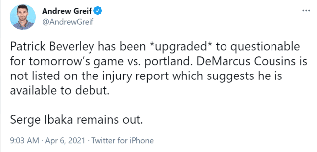 快船记者Andrew Greif报道称,考辛斯不在球队的伤病名单上,他有机会在明天对开拓者的比赛中上演快船生涯首秀。另外,快船后卫贝弗利对开拓者一战的状态是questionable(出战成疑,50%可能上场),伊巴卡继续休战。