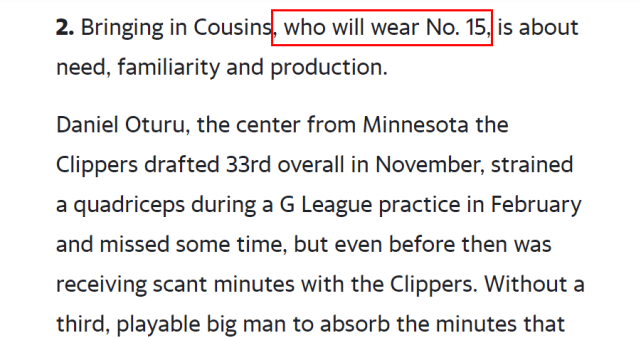 美媒报道称,来到快船的考辛斯将穿15号球衣。进入NBA后,考辛斯只穿过两个号码,他在国王、湖人(注:没上过场)、火箭和快船穿15号,在鹈鹕、勇士穿0号。考辛斯将是快船队史上第15位身穿15号球衣的球员。