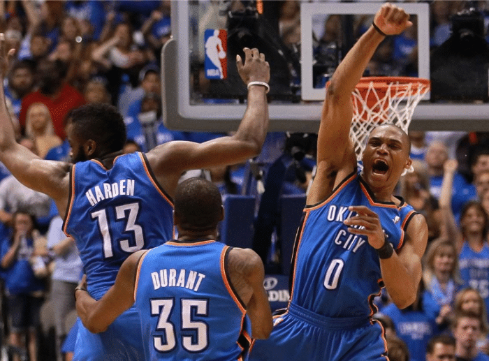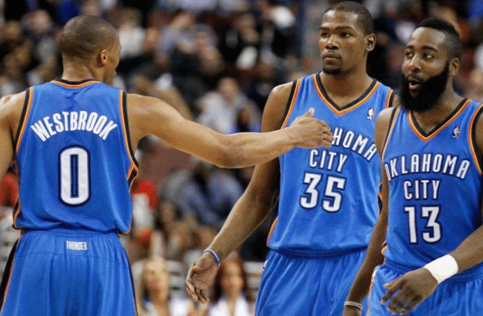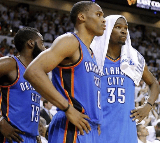 三兄弟当中,最先获得MVP的是大哥杜兰特。在13至14年,他场均可以得到32分7.4篮板5.5助攻的数据,并且带队以59胜32负获得了联盟第二的战绩。那个赛季因为威少受伤,雷霆最常用的战术就是伊巴卡和杜兰特打挡拆,作为联盟最高效得分手之一的杜兰特,他投出了50.3%的投篮命中率,同时三分命中率也达到了惊人的39.1%。从那一刻起,“死神杜兰特”的称号,响彻联盟!