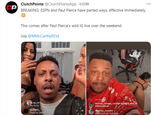 皮尔斯的笑容更多的是苦笑,一脸苦笑,这下把工作玩掉了,有点晚节不保啊!此前湖人球员库兹马点评皮尔斯有点道德败坏。